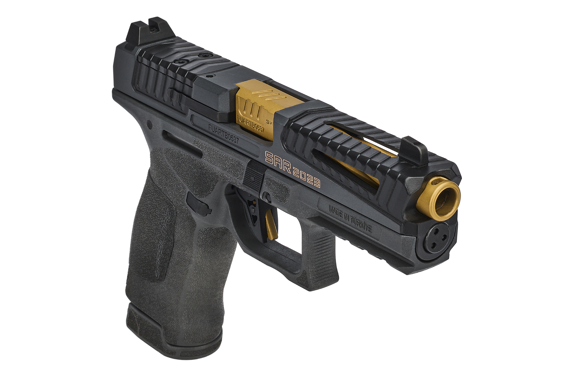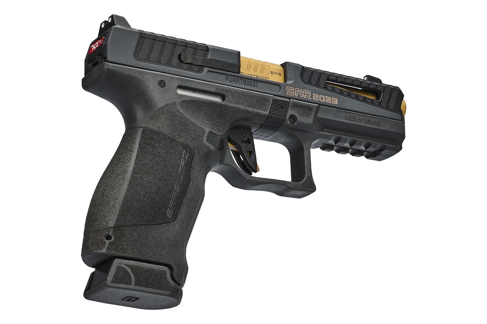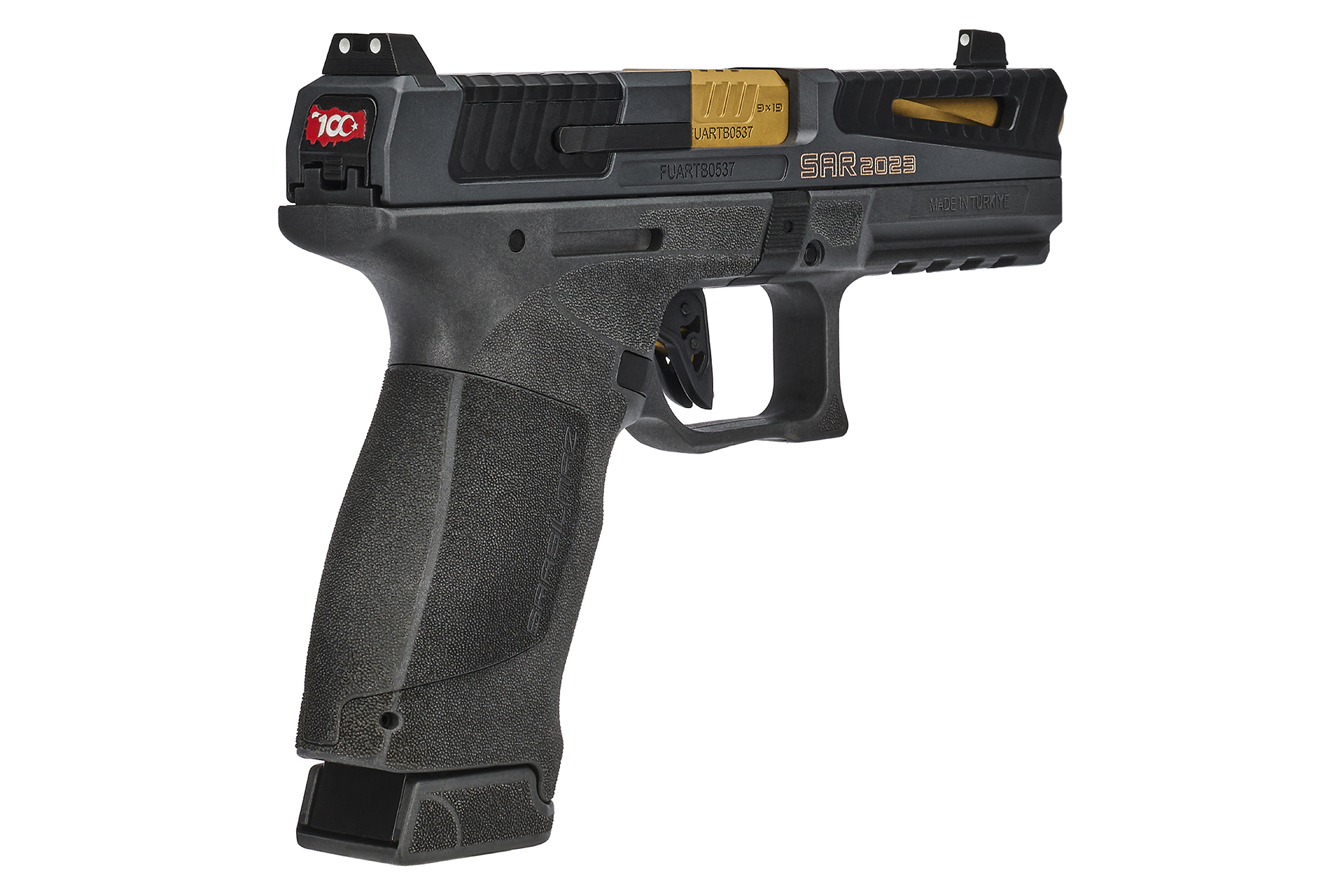 İkinci yüzyılına giren Türkiye Cumhuriyeti’nin başarılarla dolu tarihini ve gelecek hedeflerini simgeleyen tasarım ögeleriyle zenginleştirilen tabanca, bu doğrultuda dikkat çekici bir görünüm sunuyor. Kalite, yenilik ve performansın ön planda olduğu SAR 2023, kavramayı kolaylaştıran ergonomik kabza yapısı ve sürgü üzerinde kolay ve hızlıca atışa hazır hale getirilmek üzere tasarlanmış ön arka çentikleriyle her zaman üstün bir atış deneyimi sağlıyor. 15-17 mermi kapasiteli şarjör seçenekleri ve sadece 730 gramlık boş ağırlığı ile güvenilir ve hafif bir tabanca arayanlar için optimum çözüm sunan SAR 2023, özel tasarım 90 derece spor tetik sayesinde kısalan reset mesafesiyle kullanıcıya kusursuz bir atış hassasiyeti sunuyor, bu özellik ayrıca daha hızlı ve isabetli tekrarlı atışlara da olanak tanıyor. SAR 2023’ün kapak üzerindeki soğutma kanalları ise özellikle seri atışların ardından namlunun daha hızlı soğumasını sağlayarak geri tepmeyi önemli ölçüde azaltıyor. Sahip olduğu picatinny ray sistemi sayesinde her türlü aksesuara kolayca uyum sağlayan SAR 2023, ayrıca reddot kullanımını kolaylaştıran tasarım özellikleriyle de çok yönlü bir tabanca. Ergonomik yapısı ile “M” ve “L” ebatlarında değiştirilebilir sırtlık özelliği de SAR 2023’ün öne çıkan diğer avantajları arasında. SAR 2023, teknik özelliklerinin yanı sıra göz alıcı tasarım unsurlarıyla da Türkiye Cumhuriyeti’nin 100. yaşına yakışır bir görünüşe sahip. Kapak üzerinde bulunan özel 100. yıl logosu ve gold markalama unsurlarıyla Cumhuriyetimizin ikinci yüzyılını selamlayan SAR 2023, enerjik görünümüyle geleceğe dair hedefleri vurguluyor.
